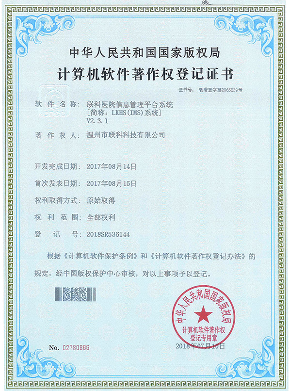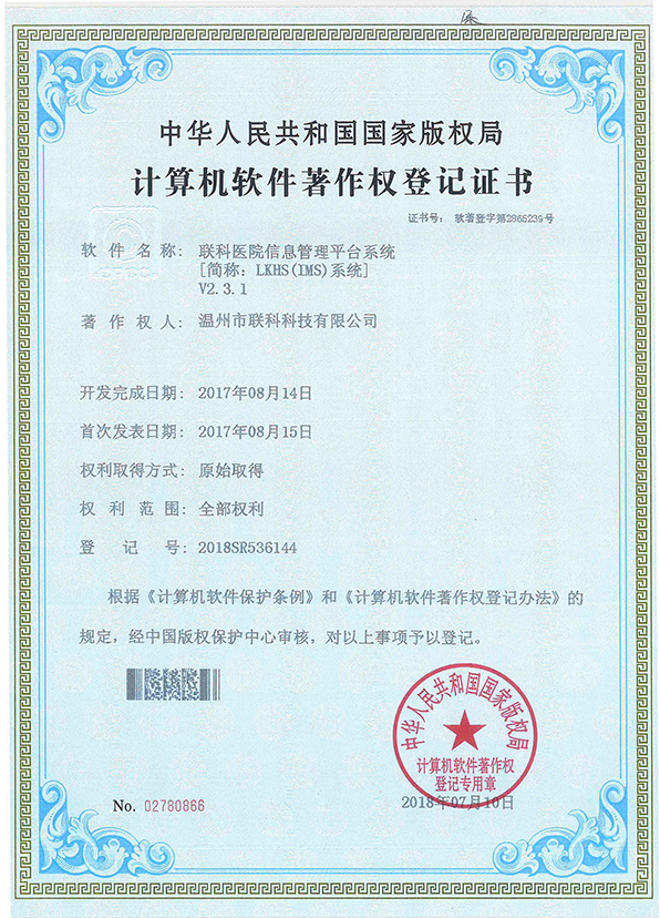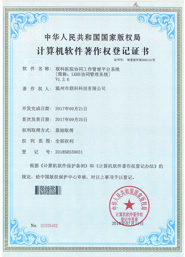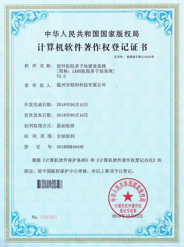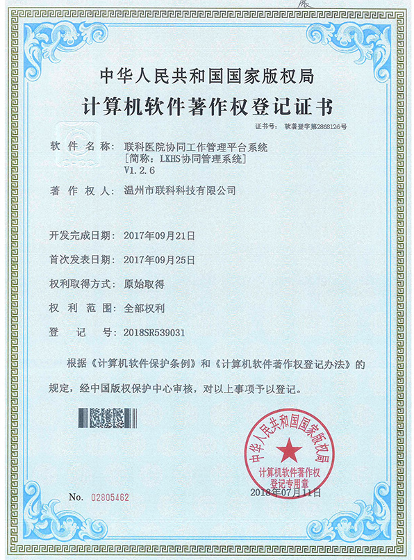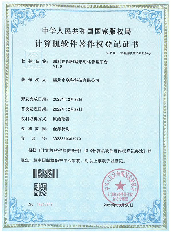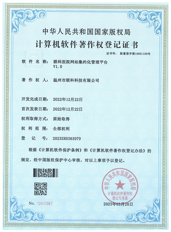 聯(lián)科醫(yī)院網(wǎng)站集約化管理平臺(tái)V1.0登記證書(shū)(2022R11L2489282)