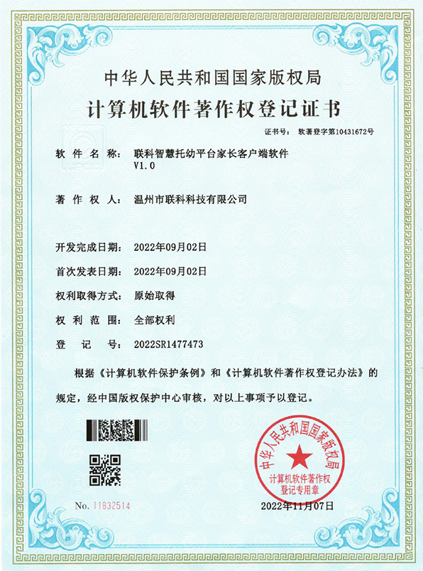 聯(lián)科智慧托幼平臺(tái)老師客戶端軟件V1.0登記證書(shū)(2022R11L2332140)