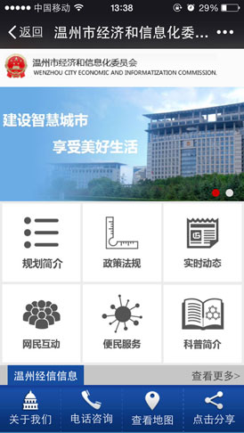 近日,由溫州市經(jīng)信委主辦的“溫州智慧城市”微信公眾平臺將正式上線運行,市民只要打開微信,查找并關(guān)注“溫州智慧城市”微信公眾號(wzzhcs)或直接掃描二維碼,便可準(zhǔn)確查詢交通、旅游、社保、出入境、房產(chǎn)、教育、圖書館、各大醫(yī)院等智慧城市建設(shè)成員單位所提供的大多數(shù)便民信息服務(wù)。
