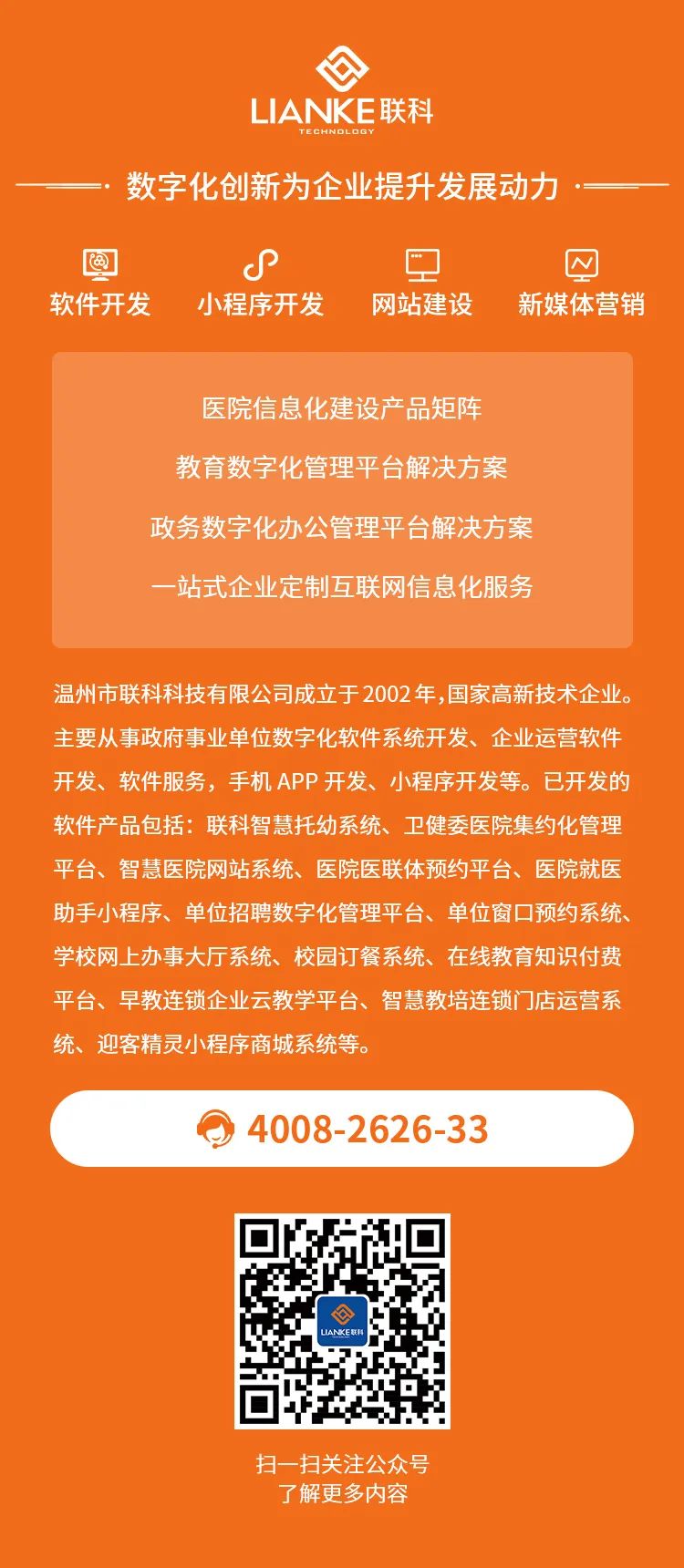 聯(lián)科自成立以來(lái)已有多年歷程,在服務(wù)醫(yī)療體系,構(gòu)建互聯(lián)網(wǎng)醫(yī)院的過(guò)程中我們積累了豐富的行業(yè)經(jīng)驗(yàn)和專(zhuān)業(yè)知識(shí)。我們以大氣的海報(bào)設(shè)計(jì)、便捷的服務(wù)體驗(yàn)、實(shí)力雄厚的專(zhuān)家科室、全面的新聞資訊以及創(chuàng)新的特色診療為核心競(jìng)爭(zhēng)力,致力于為用戶(hù)提供高品質(zhì)、全方位的服務(wù)。我們將繼續(xù)秉承“大氣、便民、專(zhuān)業(yè)、創(chuàng)新”的理念,不斷提升醫(yī)院的綜合實(shí)力和服務(wù)水平,為廣大患者提供更加優(yōu)質(zhì)、高效的醫(yī)療服務(wù)。
