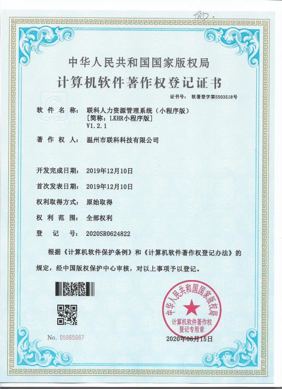 《聯(lián)科人力資源管理系統(tǒng)(小程序版)V1.2.1》于2010年06月15日被正式授予《中華人民共和國國家版權(quán)局計(jì)算機(jī)軟件著作權(quán)登記證書》,登記號為2020SR0624822。