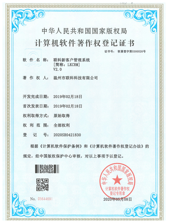 《聯(lián)科新客戶管理系統(tǒng)V2.0》于2020年05月08日被正式授予《中華人民共和國國家版權(quán)局計(jì)算機(jī)軟件著作權(quán)登記證書》,登記號為2020SR0421830。