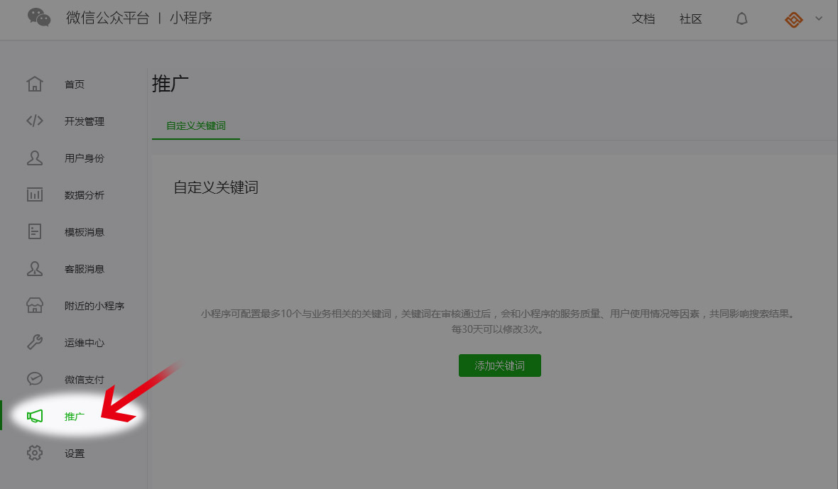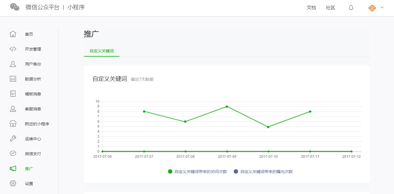 可在小程序后臺的 “推廣” 模塊中,查看通過自定義關鍵詞帶來的訪問次數(shù)。