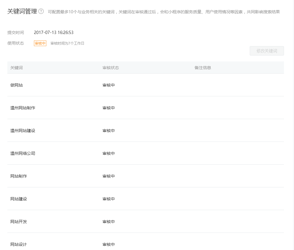 由于小程序關鍵字個數(shù)有限,只能添加10個,建議一次性添加齊全,畢竟有7天的審核日期,而且規(guī)定是和小程序業(yè)務相關詞才能通過。
