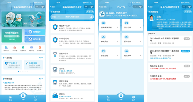 為溫醫(yī)大附屬口腔醫(yī)院開(kāi)發(fā)的微信小程序應(yīng)用,根據(jù)需求進(jìn)行整體UI設(shè)計(jì),呈現(xiàn)更好地視覺(jué)效果,優(yōu)化患者預(yù)約、查詢(xún)等功能的用戶(hù)體驗(yàn)。包括預(yù)約掛號(hào)、當(dāng)日掛號(hào)、科室介紹、物價(jià)公示、專(zhuān)家介紹、查詢(xún)就診記錄、體檢報(bào)告、醫(yī)療影像、住院清單等功能,助力醫(yī)院更好服務(wù)患者。