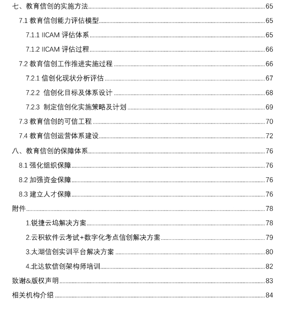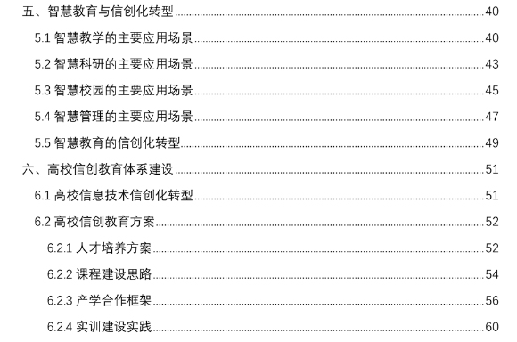 《白皮書》共分為八大章節(jié):教育信創(chuàng)的背景、教育信創(chuàng)的目標與指導原則、智慧教育的架構框架、教育信創(chuàng)的技術體系、智慧教育與信創(chuàng)化轉(zhuǎn)型、高校信創(chuàng)體系建設、教育信創(chuàng)的實施方法及教育信創(chuàng)的保障體系。